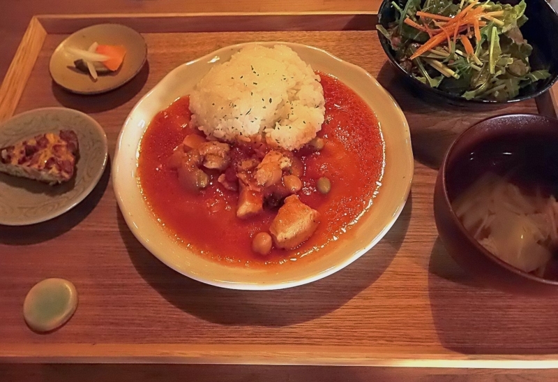メニューはつねにひとつ。その日のメニューはフェイスブックやブログに載るよう。今日は鶏肉のトマト煮込みごはんだった。飲み物が付くので、ブレンドコーヒーを付けた。